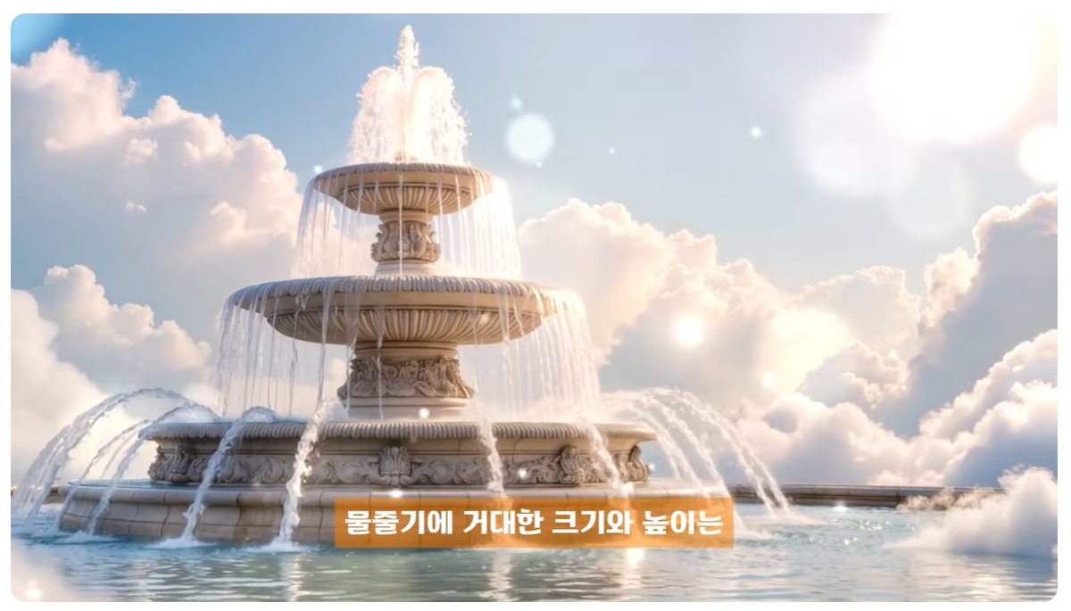 음식과 분수: 사랑스러운 분수들이 다이아몬드처럼 반짝이는 물줄기를 뿜어냈고, 거리 한편에는 천 큐빗에 달하는 긴 식탁들이 있었으며 여러 종류의 열매가 차려져 있어 누구나 자유롭게 먹고 마실 수 있었음. (379, 380, 381)